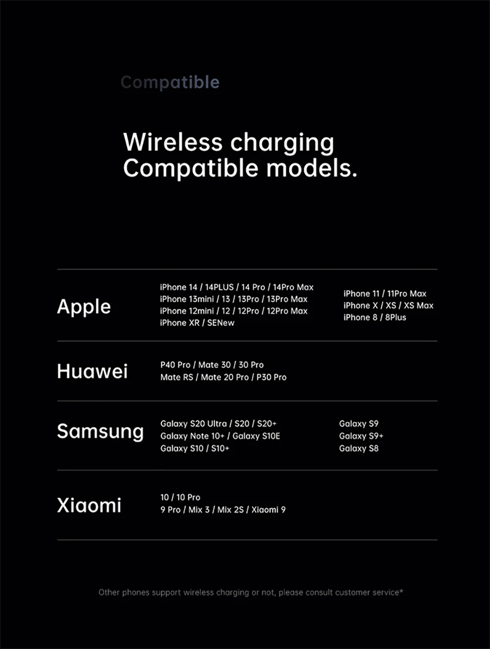 2. The wireless power bank works with all QI-enabled smartphones, for Huawei Mate P20/P30; for Samsung Galaxy S10/S10+/10e/S9/S9 Plus; for iPhone 11 Pro Max/X/Xr/Xs Max 8 8Plus and other mobile phones that support wireless charging.